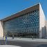 L'edificio presenta una facciata trasparente che rivela la sua scala elicoidale e la sala concerti sferica rossa.