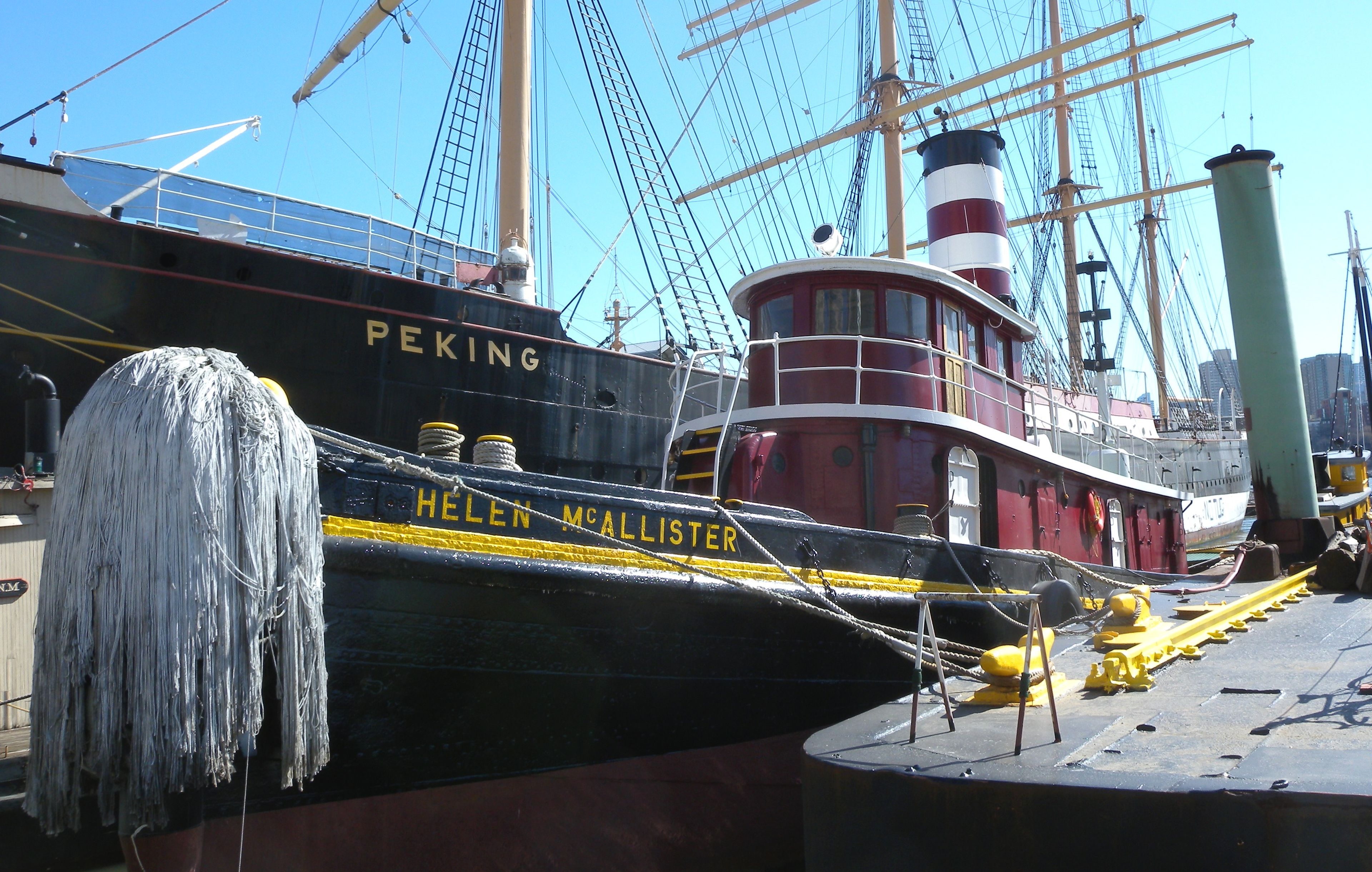 Il rimorchiatore Admiral Dewey si trova sul lungomare di Manhattan, mostrando caratteristiche dell'ingegneria marittima dei primi anni del XX secolo.