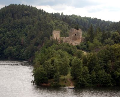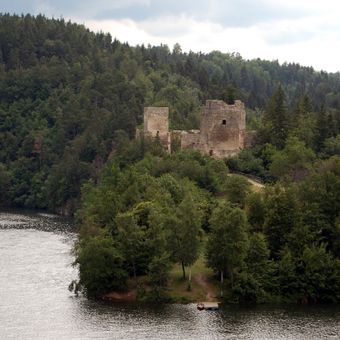 Le rovine del castello Dobra sorgono su una penisola che domina il bacino idrico Dobra, con antiche mura, cantine voltate e torri.