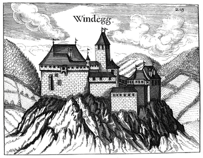 I resti del castello Windegg si ergono su una collina, presentando muri in pietra ed elementi strutturali risalenti al XII secolo.