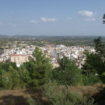 Chiva si estende su un paesaggio mediterraneo nella Comunità Valenciana, con frutteti di agrumi che circondano i quartieri residenziali e il centro storico.