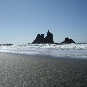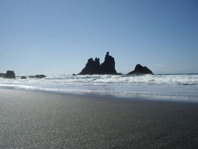 La Playa de Benijo si estende per 300 metri lungo la costa settentrionale di Tenerife, con sabbia vulcanica scura e grandi formazioni rocciose che emergono dall'acqua.