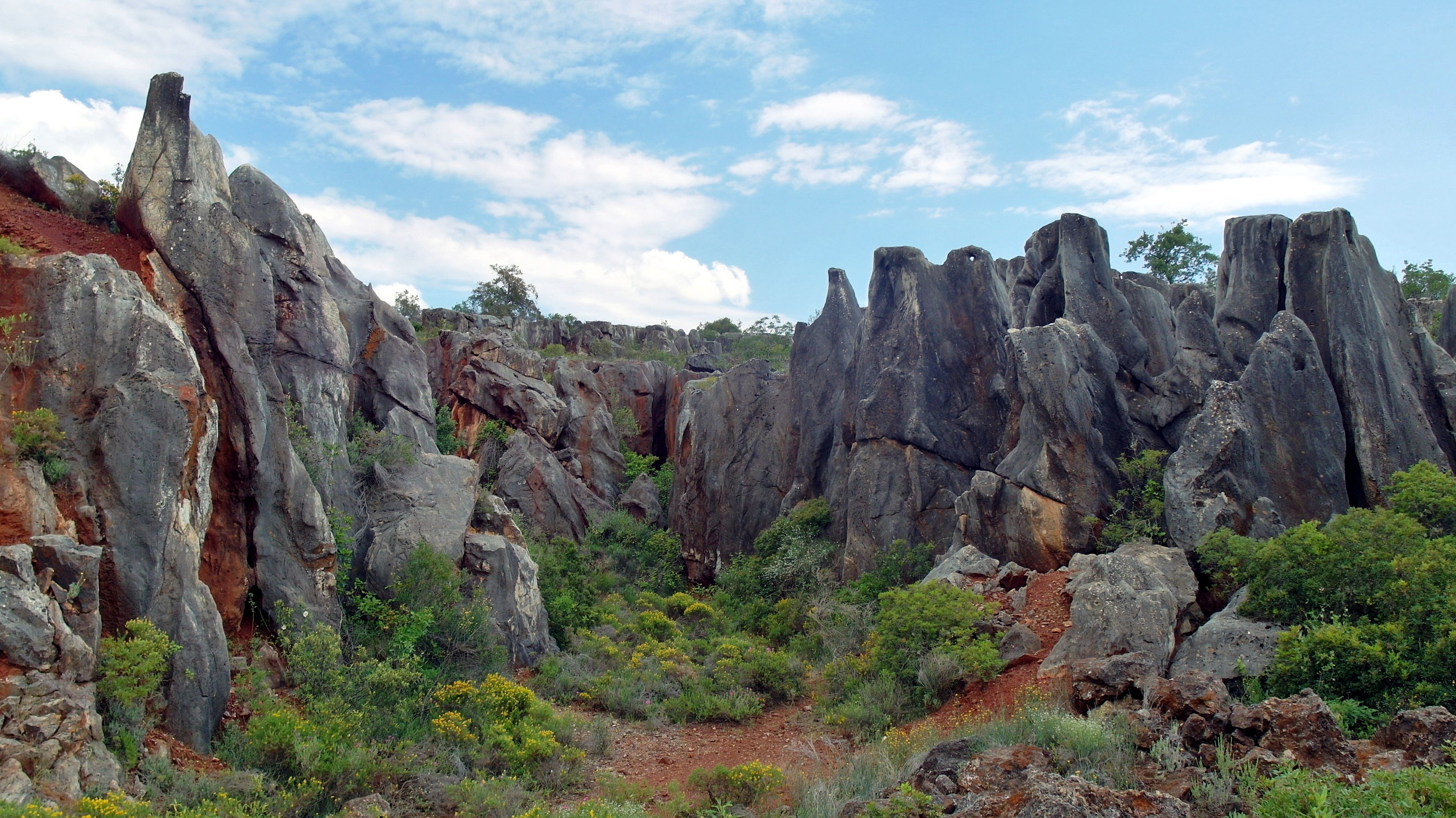 La formazione carsica presenta rocce calcaree con depositi di ferro, creando una rete di corridoi, doline, grotte e guglie naturali.