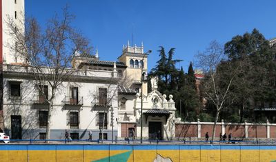 Il palazzo integra elementi neoplatereschi e neobarocchi andalusi, con balconi curvi e decorazioni in ceramica caratteristiche dell'epoca.