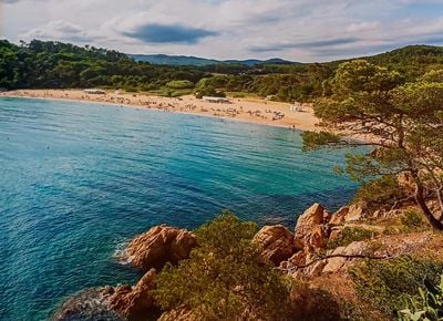 La Platja de Castell si estende lungo la Costa Brava, con sabbia dorata circondata da fitti boschi di pini e campi agricoli.