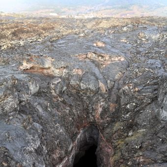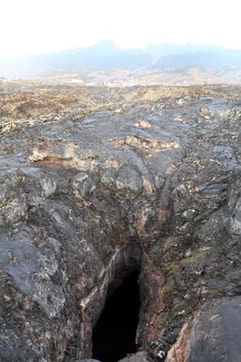 La grotta vulcanica si estende attraverso il terreno con una larghezza di circa tre metri, mostrando caratteristiche formazioni di lava solidificata.