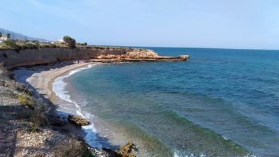 Cala de La Foradada si estende per 100 metri lungo la Costa del Azahar, con una combinazione di sabbia dorata e ghiaia contro formazioni rocciose.
