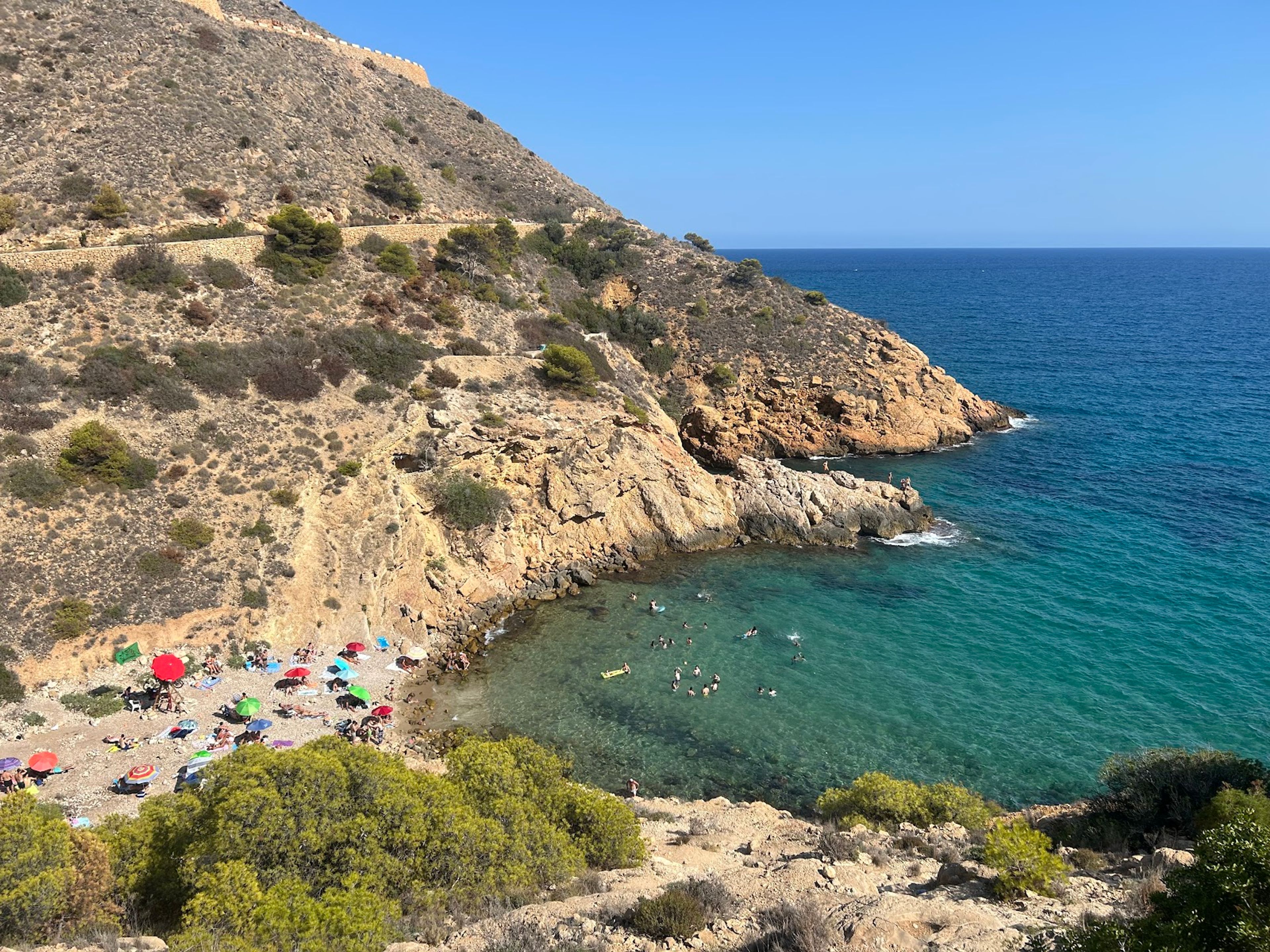 La caletta si estende per 60 metri di lunghezza e 6 metri di larghezza, circondata dalle ripide scogliere della Sierra Helada.