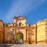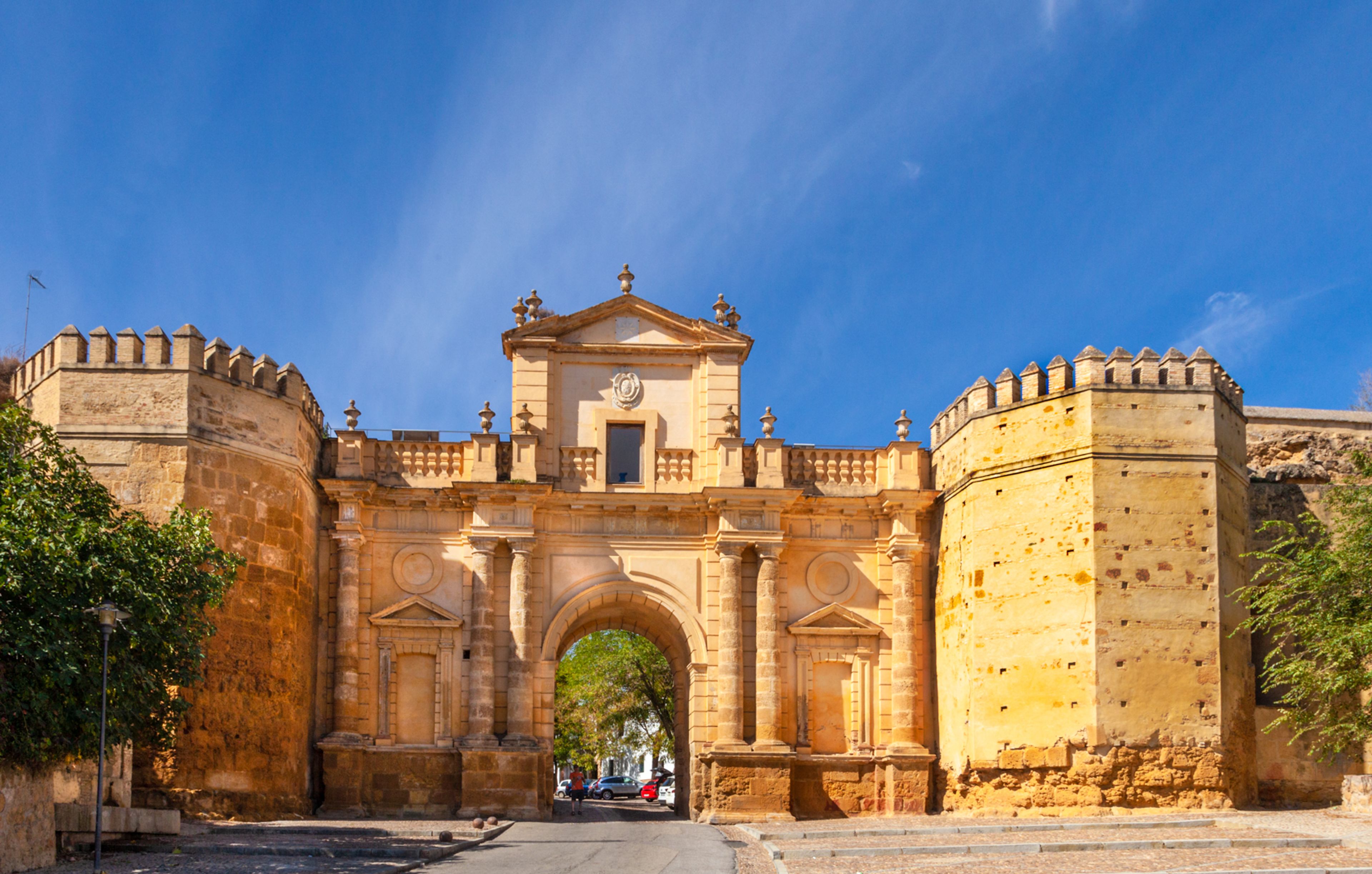 La Porta di Cordova presenta due torri difensive ottagonali che fiancheggiano un ingresso centrale con muri in pietra squadrata del primo secolo.