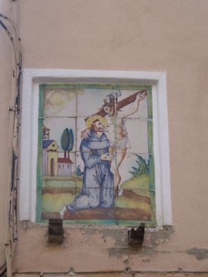 Ceramic panel of Saint Francis hugging Christ, ceramic panel in Ontinyent