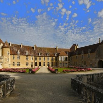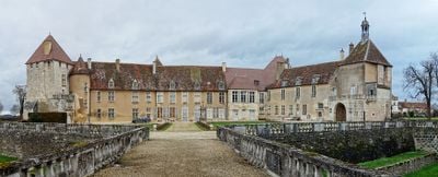 La fortezza in pietra presenta torri difensive, un sistema di fossati e diversi cortili distribuiti sui suoi vasti terreni nella regione della Borgogna.