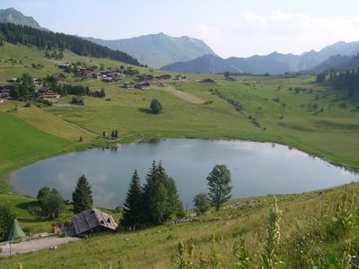 Il lago si trova a 1450 metri di altitudine nella catena degli Aravis, circondato da prati alpini e vette montuose.