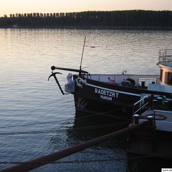 Il piroscafo Radetzky si trova sulla riva del Danubio, mostrando una struttura metallica di 56 metri con elementi di design del periodo navale.