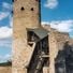 I resti del castello includono una torre rotonda, strutture sotterranee e sezioni del muro difensivo posizionate su un pendio con un fossato asciutto.