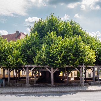 L'antico tiglio presenta una corona ovale piatta sostenuta da 24 pilastri in legno, che si estende per oltre 20 metri di diametro.
