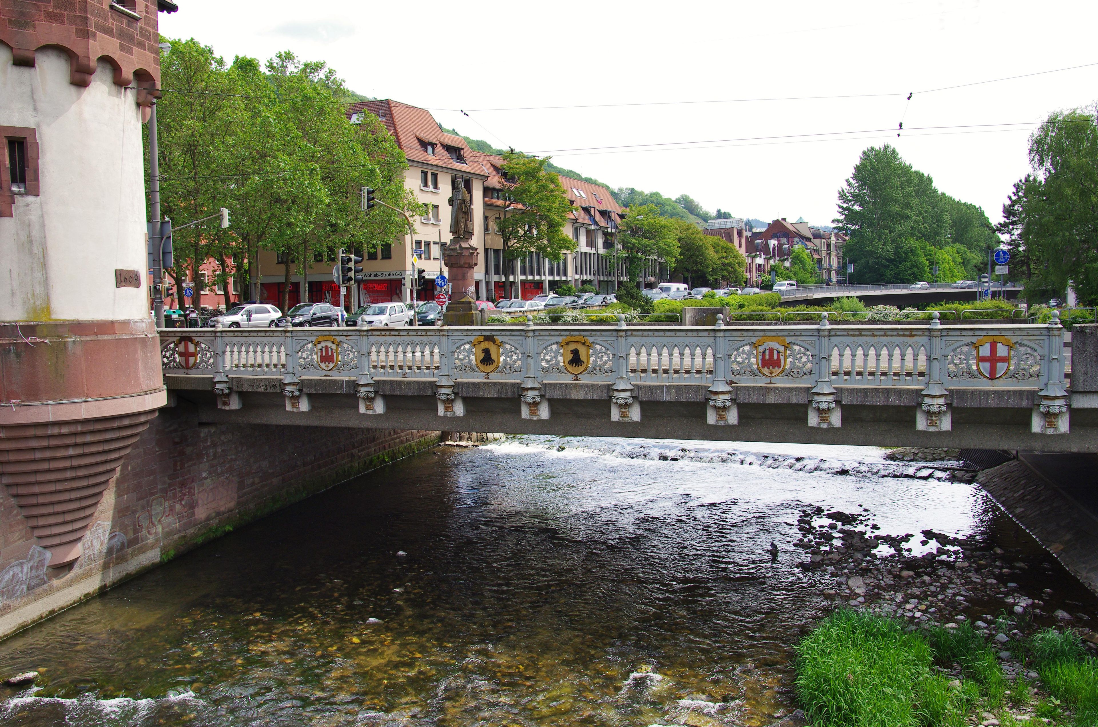 Il Schwabentorbrücke attraversa il fiume Dreisam, collegando il centro città ai quartieri orientali con binari tranviari e corsie stradali.