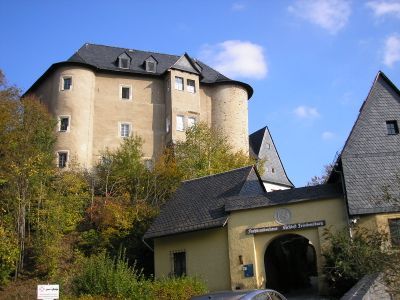 Il castello in pietra sorge su una collina sopra la valle Sormitz, con una torre medievale e tre ali architettoniche di periodi diversi.