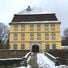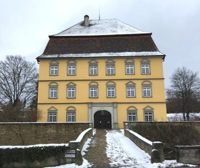 L'edificio principale del castello Freiherren von Palm, dipinto di giallo, presenta una pianta quadrata e un alto tetto mansardato con tre livelli distinti.