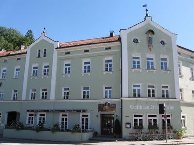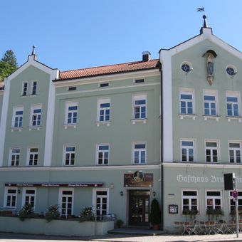 Gasthof Bruckbräu, dreigeschossiger langgestreckter Eckbau mit Risaliten, Mittelteil mit Hausmadonna, bezeichnet mit dem Jahr 1860, nach Brand durch Baumeister M. Isola verändert wiederaufgebaut 1899/1900