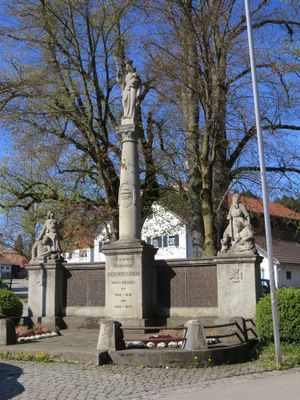 Kriegerdenkmal, mariensäule auf hohem Postament, flankiert von zwei Figurengruppen, von Martin Kraut, 1924