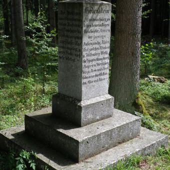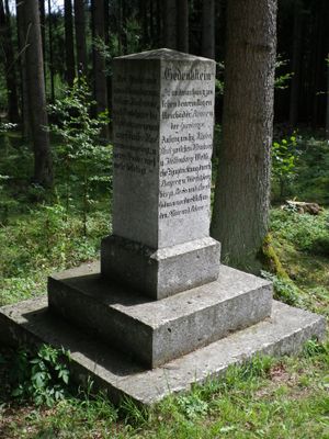 Gedenkstein, zur Erinnerung an den Limesverlauf, Steinpfeiler auf zweistufigem Podest, mit Inschrift, 1861; an der Straße nach Herlingshard, im Wald