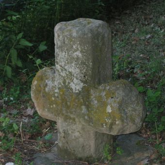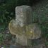 Steinkreuz am Waldfriedhof, mit abgerundeten Ecken und stark verwitterter, geöffneter Schere auf der Vorderseite