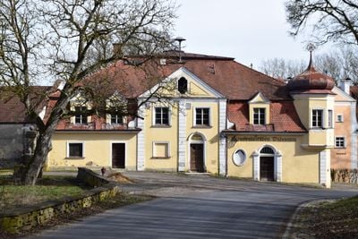 Il complesso del castello include una cappella convertita del 1556 con decorazioni in gesso, una torre con bovindo e una cupola a cipolla.