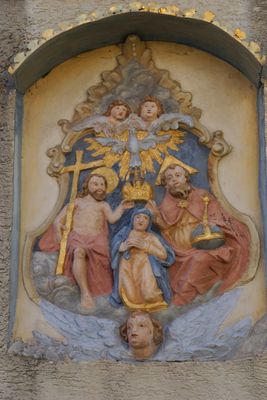 Steinrelief der Marienkrönung, Über dem Eingang des Bauernhauses, Mitte 18. Jahrhundert