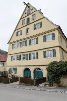 Detwang 22, dreigeschossiger massiver Giebelbau mit vorkragenden Geschossen, steilem Satteldach, Kranausleger und reich profilierten Fenstern und Portalen, 16. Jahrhundert