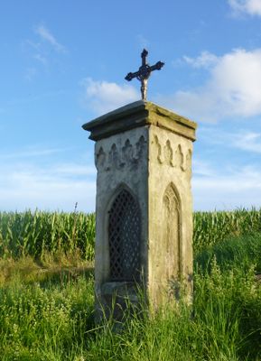 Bildstock, neugotische Stele mit vergitterter Spitzbogennische und Gusseisenkreuz, um 1880; rund 150 m südwestlich von Krainhof am Feldweg
