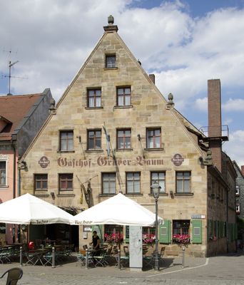 Gasthof Grüner Baum, zweigeschossiger giebelständiger Sandsteinquaderbau in Ecklage mit Satteldach und eckigen, vasenbesetzten Giebelvoluten, um 1800, Erdgeschoss wohl 17. Jahrhundert