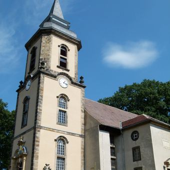 La Chiesa Protestante presenta una torre occidentale a tre piani del 1744, una navata rettangolare del 1859 e un'abside semicircolare con finestra rotonda.