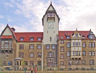 Rathaus Schönefeld, Rathaus in offener Bebauung in Ecklage Wenckstraße mit Treppenanlage (Putzfassade); architekturgeschichtlich bedeutsamer Verwaltungsbau mit Bedeutung für die Ortsentwicklungsgeschichte