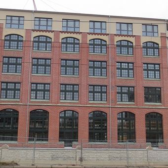 Beckerstraße 11, Chemnitz-Kapellenberg, Großer, winkelförmiger Industriebau, städtebaulich bedeutsame Lage direkt an der Chemnitz, qualitätvolle Fassadengliederung (Klinkerfassade)