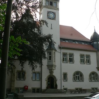 Rathaus Chemnitz Siegmar, Stattlicher Rathausbau in Neorenaissanceformen, asymmetrisch gruppierte Anlage mit beherrschendem Uhrturm, schlichter rückwärtiger Sparkassen-Anbau der 1930er Jahre mit Sgraffitoschmuck. Heute AZURIT Seniorenzentrum Altes Rathaus