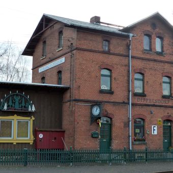 Empfangsgebäude '''Bahnhof Friedewald Bad''' Am Bahnhof 1, Einzeldenkmale der Sachgesamtheit Kleinbahn Radebeul-Radeburg: Empfangsgebäude mit Bahnhofsuhr, Schuppen, Bahnsteigbeleuchtung, Weichen und Signale – alte Ortslage Dippelsdorf, das Empfangsgebäude ein gründerzeitlicher Ziegelbau, eisenbahngeschi