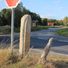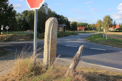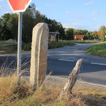 Kamjentny pućnik pola Kozarc, Grob behauene Natursteinstele mit quadratischem Querschnitt und einem dachartigen Abschluss, Inschrift mit der Jahreszahl 1854. Wegestein als Zeugnis der verkehrstechnischen Erschließung des ländlichen Raumes von verkehrsgeschichtlicher Bedeutung