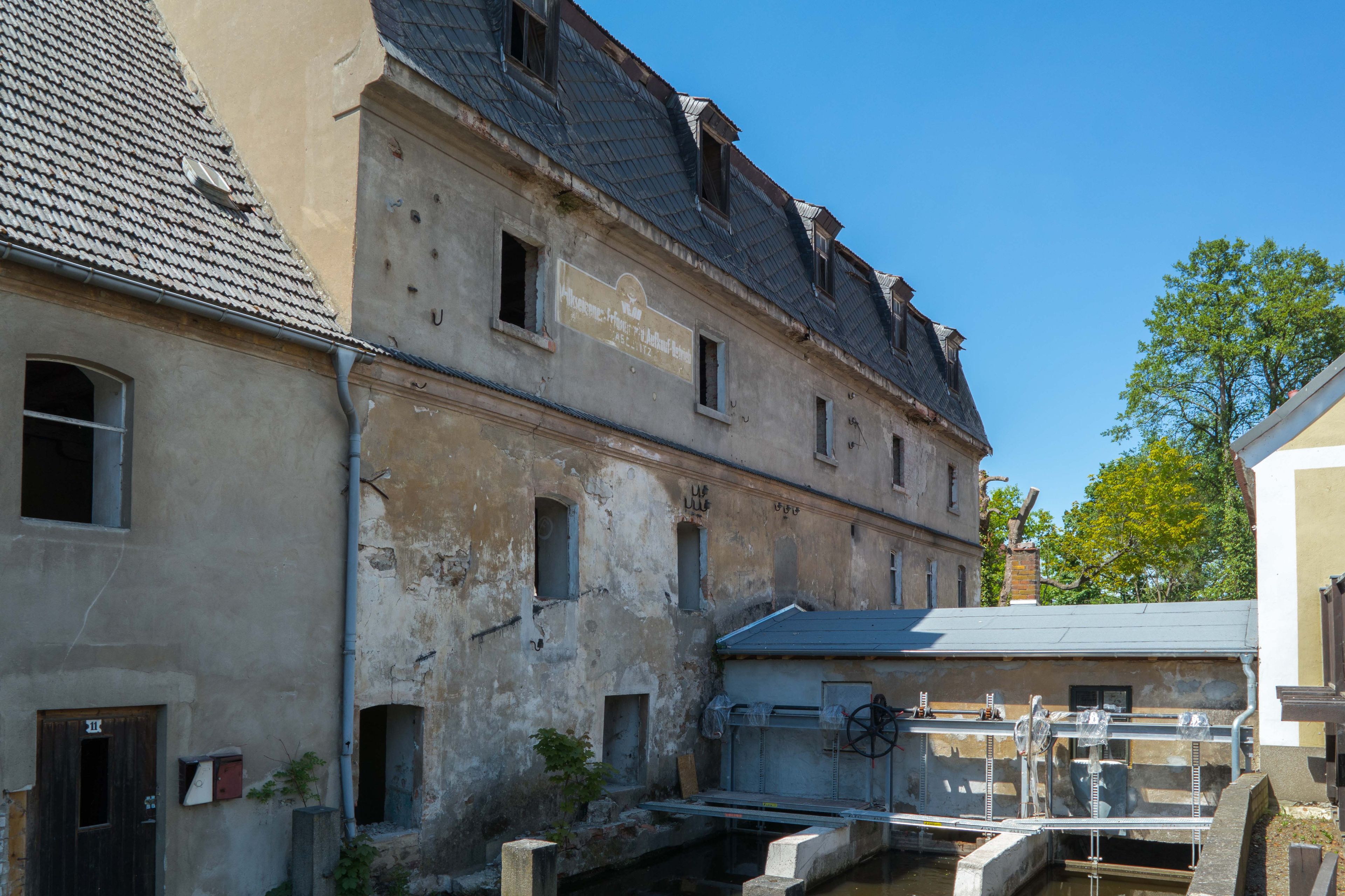 Mühlengebäude (mit technischer Ausstattung) und gegenüber liegendes Wohnhaus Mühlweg 2; 4