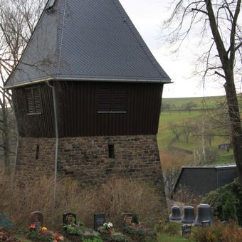 Kirche, frei stehender Glockenturm und Denkmal für die Gefallenen des Ersten Weltkrieges Hauptstraße 50, church building in Lößnitz, Germany