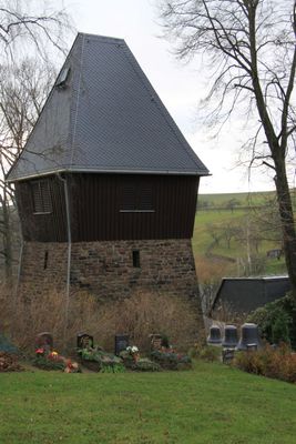 Kirche, frei stehender Glockenturm und Denkmal für die Gefallenen des Ersten Weltkrieges Hauptstraße 50