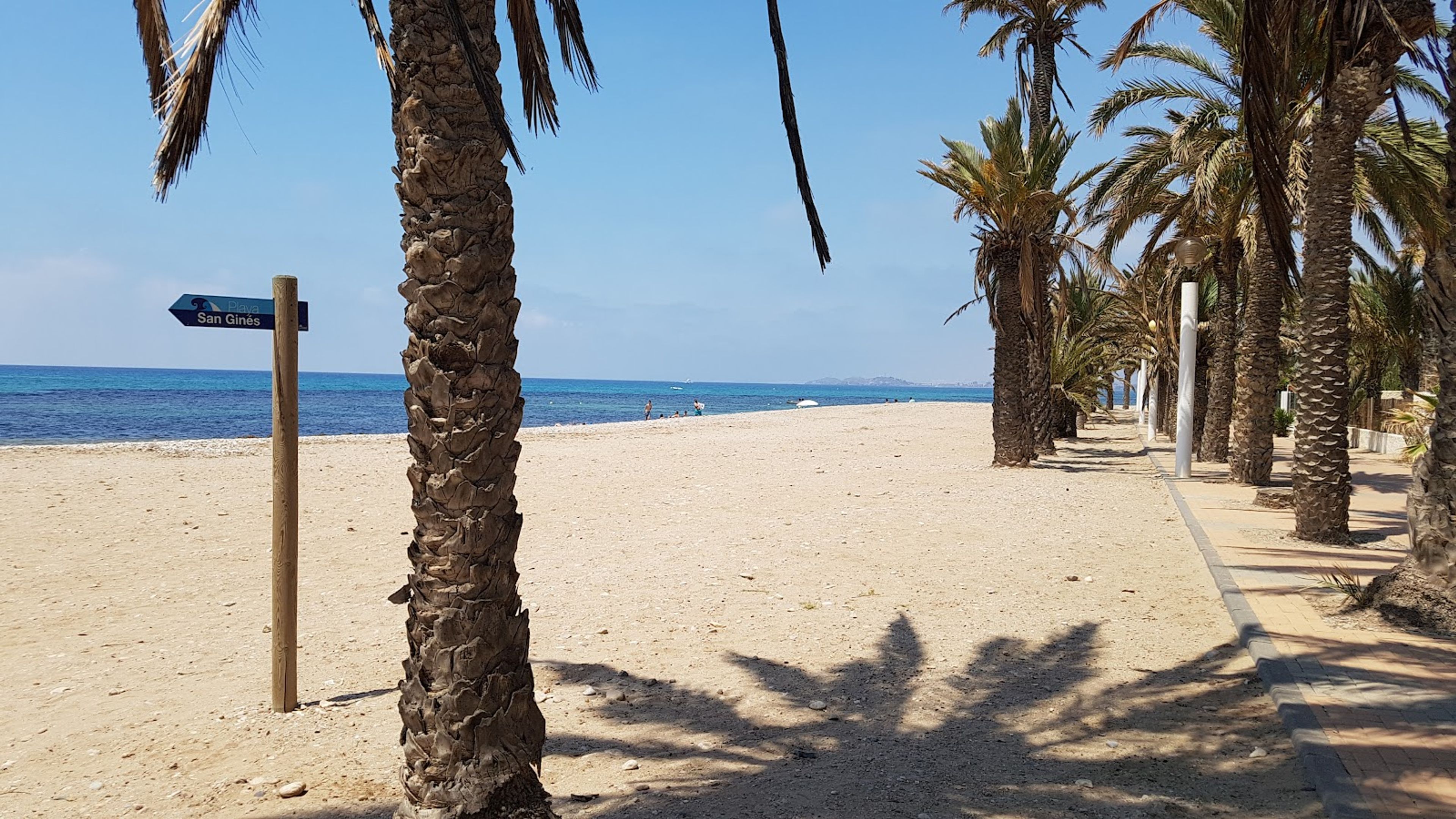 La Playa de San Ginés si estende per 800 metri lungo la costa di Cartagena, presentando una combinazione di sabbia dorata e ghiaia bordata da palme.