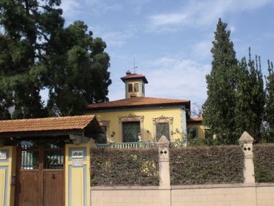 Villa Amparo mostra architettura valenciana tradizionale con dettagli ornamentali e facciate in pietra, situata in una proprietà con giardini.