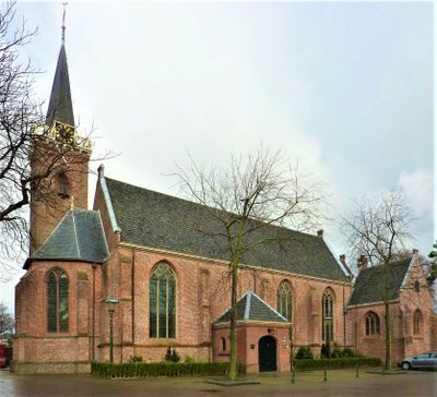 La Dorpskerk presenta una navata a tre corsie di uguale altezza, con una cappella battesimale e una guglia ottagonale coperta di ardesia.
