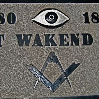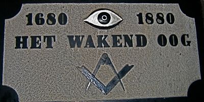 La facciata mostra simboli marittimi ed elementi massonici, tra cui un rilievo dell'Occhio che Tutto Vede con l'iscrizione 'het wakend oog 1680-1882'.
