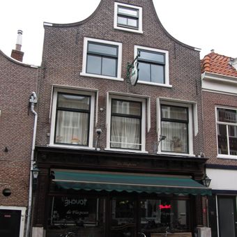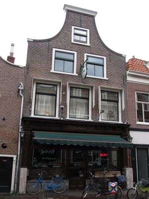 Pand met klokgevel, 1747, gebeeldhouwde natuurstenen voluten op de hoeken aan weerszijden