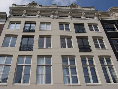Pand met gevel onder zandstenen lijst met consoles en attiek waarin een tijger, building in Amsterdam, Netherlands