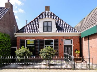 Pand zonder verdieping tegen gevels met houten gootlijst onder hoog schilddak met dakkapellen en topschoorstenen, building in Ferwerderadiel, Netherlands
