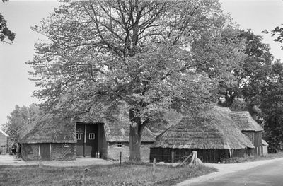 Boerderij onder rieten schilddak met onderschoer en een streek eigen schuur onder rieten schilddak met in een van de lange zijden een dakkapel-vormig uitgebouwde inrit