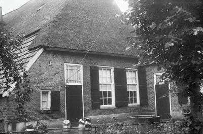 Boerderij onder rieten schilddak met onderschoer en een streek eigen schuur onder rieten schilddak met in een van de lange zijden een dakkapel-vormig uitgebouwde inrit