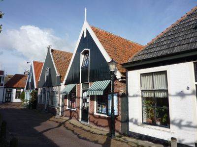 Klein huisje onder een dwars dak met de nummers 8 en 12. Aardige details aan vensters. Luiken en goede deur. Achterschot